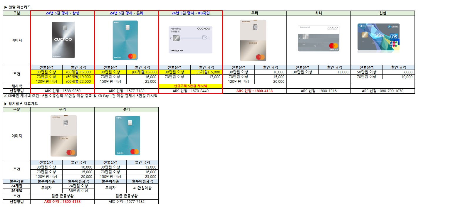 각 렌탈사의 월 렌탈료, 제휴카드혜택, A/S기간, 약정기간, 혜택 등 비교하고 선택해 보세요.